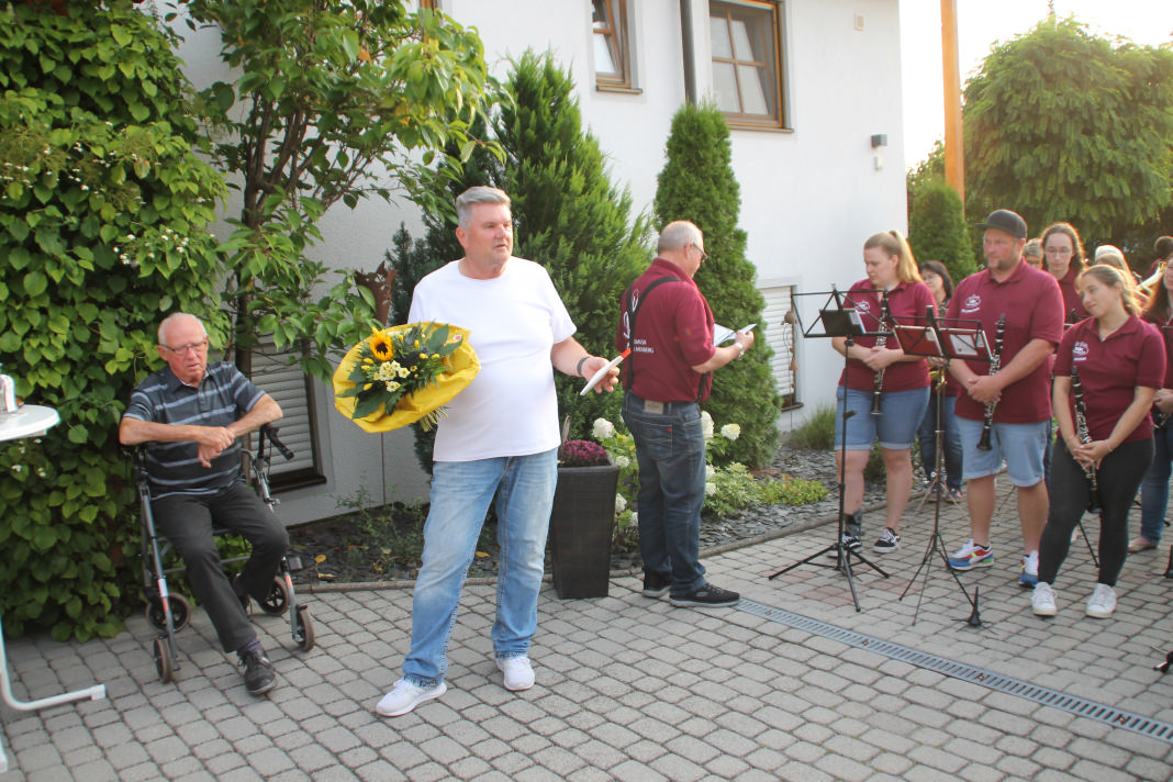 Die Blasmusik spielte dem Jubilar ein Ständerla. Danach richtete Karin Stecher einige Worte an den Jubilar, in Erinnerung, wie er das Musizieren von Kindesbeinen an begann. Zum Lernen ging er mit noch einigen Kindern zum damaligen musikalischen Leiter, Karl Biburger. Danach zu den Proben. Er entwickelte sich zu einem hervorragenden Trompeter und Sänger der Blasmusik. Mit einem Geschenk von der Blasmusik und einigen Musikstücken sprach danach überganslos Harald Kaiser.